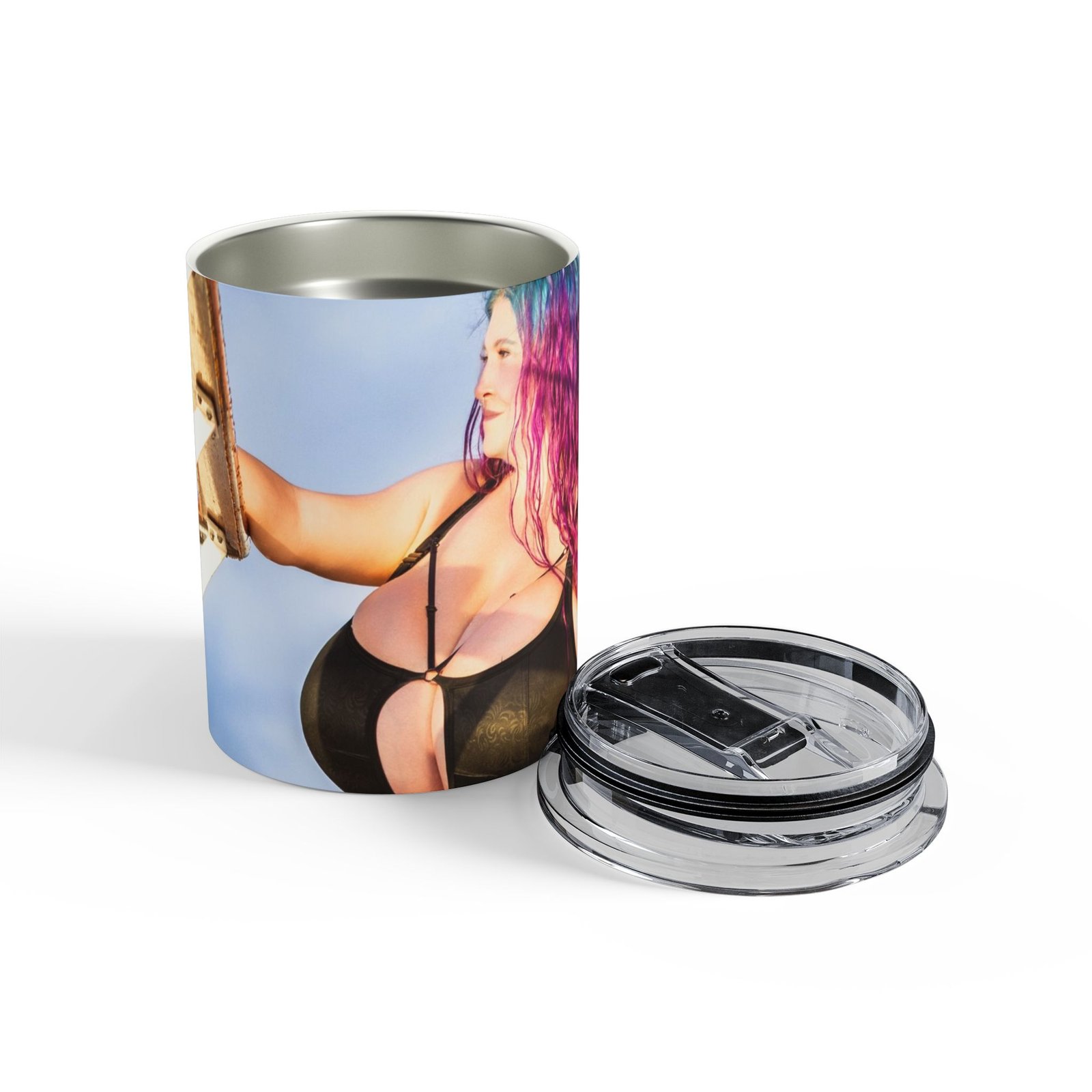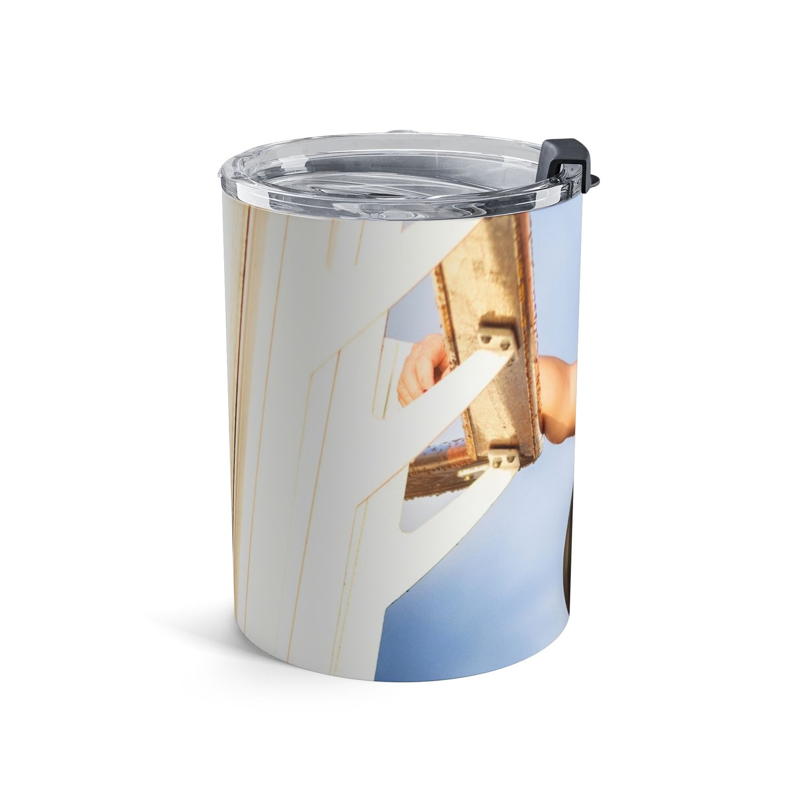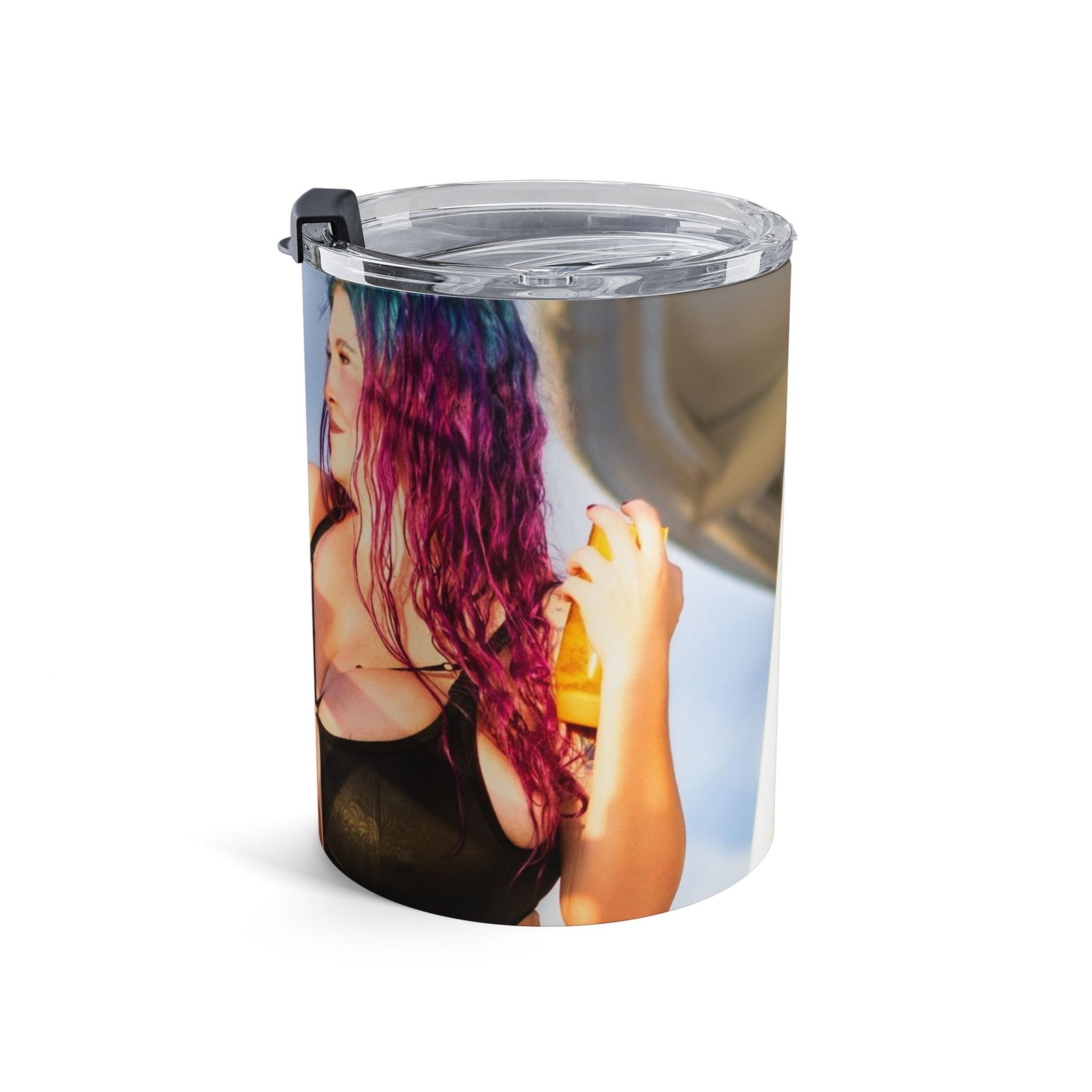 A compact, well-insulated 10oz tumbler designed to keep drinks at the right temperature whether you’re rushing between sets, taking a quiet moment at the studio, or heading out for a sunrise shoot. Its stainless steel, double-wall construction locks in heat or chill, while the clear push-on lid with a rubber gasket gives a secure seal and easy sip access. Smooth rounded edges and a dishwasher-safe finish make it simple to care for after a long day. The wraparound design adds personality to your cup — carried like a statement piece, used like a reliable everyday essential.